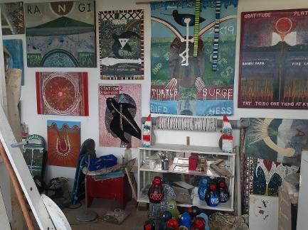 The West Wall is now being assembled and paintings worked on. In one photograph you are looking down the Aisle at older work and penguins being assessed, tidied up, modified in major or minor ways to work towards another finished display area as the South Wall nearly is. The other photograph shows the corner where the South Wall meets the West Wall and once again older works awaiting attention .