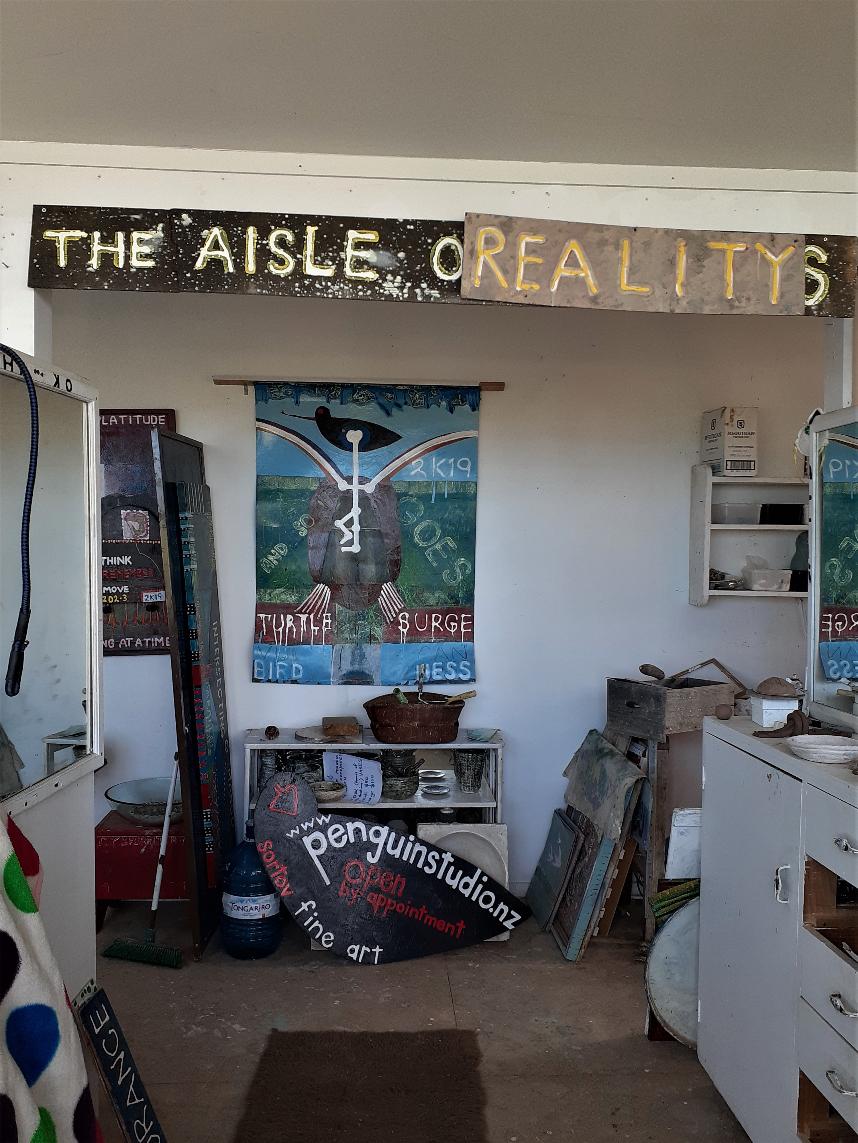The old Vulcan painting has gone to the West Wall where it can be seen hanging above a cabinet on top of which can be seen the remains of the deformed LPG cylinder base that has been used for the Count Your Blessings dish. Plaster moulds were produced to capture the bent egg- shaped form from the explosion. The final cast can be seen peeping out from behind one of the two Oyster shaped Penguin Studio Signs. The AISLE OF DREAMS Sign at the top of the Photograph has had the DREAMS word partially concealed by a REALITY Tag, one of a number of tags that can be used to replace the word DREAMS. Another Tag IGNORANCE can be seen at the extreme left of the photo.